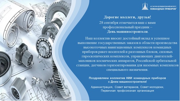 26 сентября в АО «НИИ командных приборов» прошло торжественное собрание, посвященное празднованию Дня машиностроителя. В своем выступлении генеральный директор АО «НИИ командных приборов» отметил, что коллектив НИИ вносит значимый вклад в обеспечение научно-технического лидерства России. Принявший участие в мероприятии депутат Законодательного Собрания Санкт-Петербурга А.Н. Цивилев так же поздравил коллектив с праздником, высоко оценив научную и социальную активность работников организации.